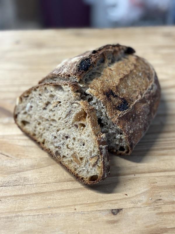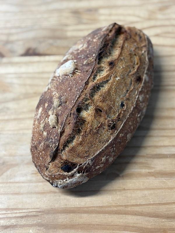 Pain fabriqué avec notre farine de blé T80, du levain naturel, des figues et des amandes torréfiées. Façonné à la main, il est cuit dans un four à bois.